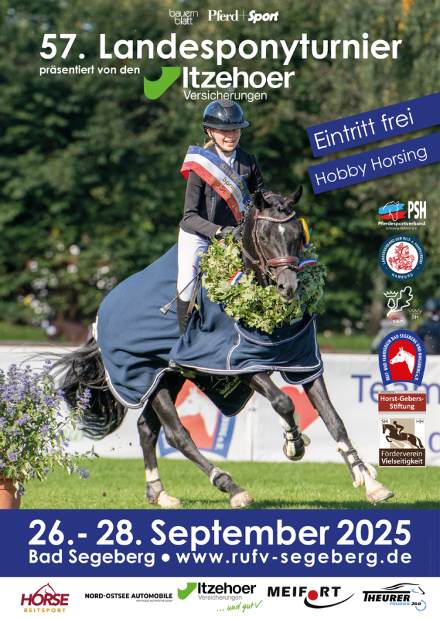 vom 26. bis 28. September 2025 freuen wir uns auf und mit Euch die Landesmeister der Ponyreiterinnen von Schleswig-Holstein und Hamburg im Springen, Dressur und Vielseitigkeit zu kühren, die Landeschampions der Ponys vom Pferdestammbuch SH/HH zu bestaunen und großes Teamwork beim Abteilungswettkampf um die Landes-Pony-Standarte zu erleben! Besonders freuen wir uns auch auf die Prüfungen des Hobby Horsings! Seid gespannt!